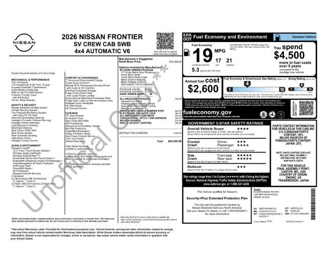 Rugged, capable, and packed with premium features, the 2026 Nissan Frontier SV is the ultimate companion for your next adventure. With a city fuel economy of 18 MPG and a highway rating of 23 MPG, this truck delivers impressive efficiency without sacrificing power. Experience the perfect blend of performance, utility, and comfort behind the wheel of the Frontier SV.